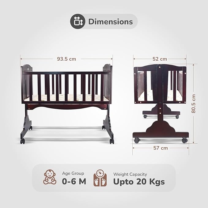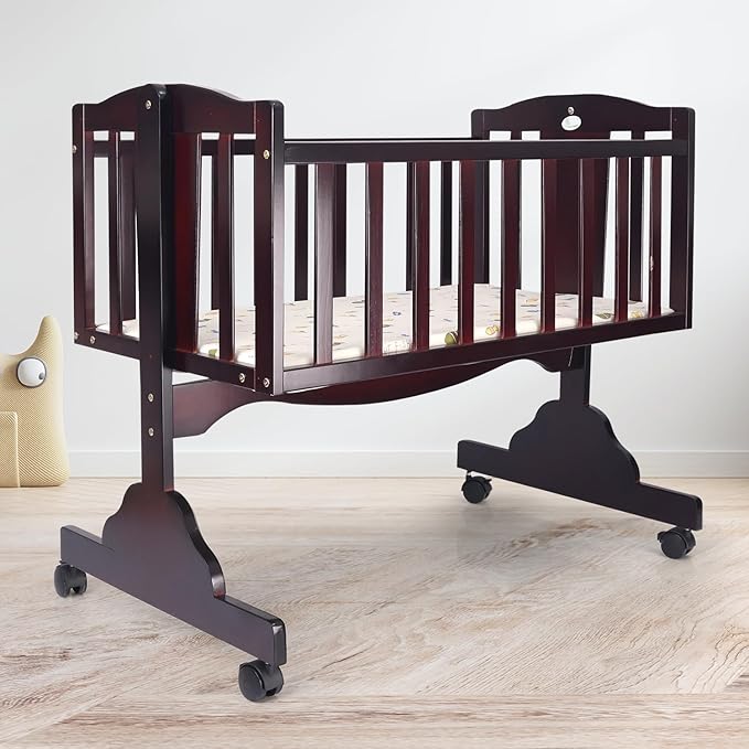 Baby Wooden Cradle, Cot & Crib for Newborn Kids Bedding Set, Sleep Swing with Wheel Lock Function, Age 0-6 Months Upto 20 Kg Weight Capacity (Brown)