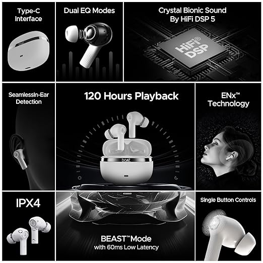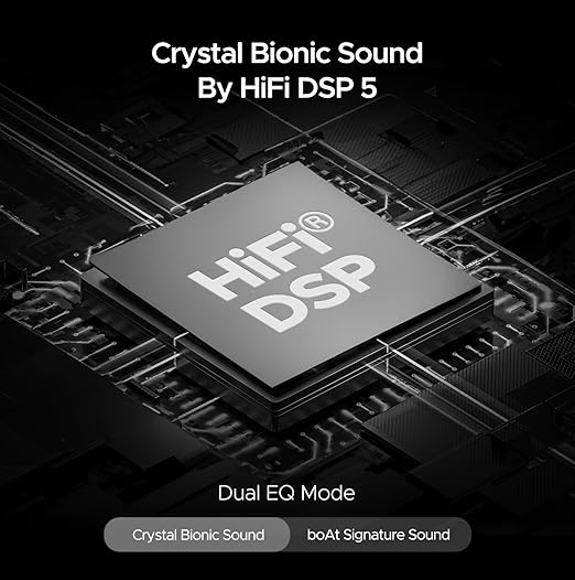 • Crystal Bionic Sound with Dual Modes- These true wireless earbuds have Crystal Bionic Sound powered by Hifi DSP 5 which support dual eq modes: boAt Signature Sound and boAt Balanced Sound
