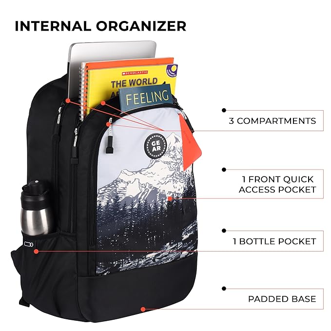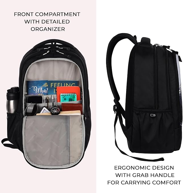 • Ergonomic Fit : Water Repellent Fabric : 3 Wide Access Compartments with Multiple Pockets : High Quality Prints : Intuitive Organization & Access : 1 Bottle Pocket : 1 Zippered Front Pocket : Advanced Internal Organizer : Non-Padded Laptop Sleeve : Padded Base : Easily Adjustable Shoulder Straps : Padded & Cushioned Back Support : Padded Grab Handle for Easy Carry : Bartacked Load Points : Long Lasting Zippers & Pullers : Light-weight